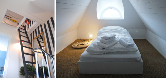 H ier geht’s unters Dach. Maritim, puristisch gestaltet, ist diese Dachnische der richtige Platz für Romantiker: der vierte Schlafplatz. Bitte beachten Sie, die Nutzung dieser Fläche erfolgt auf eigene Verantwortung und ist für Kleinkinder nicht geeignet.